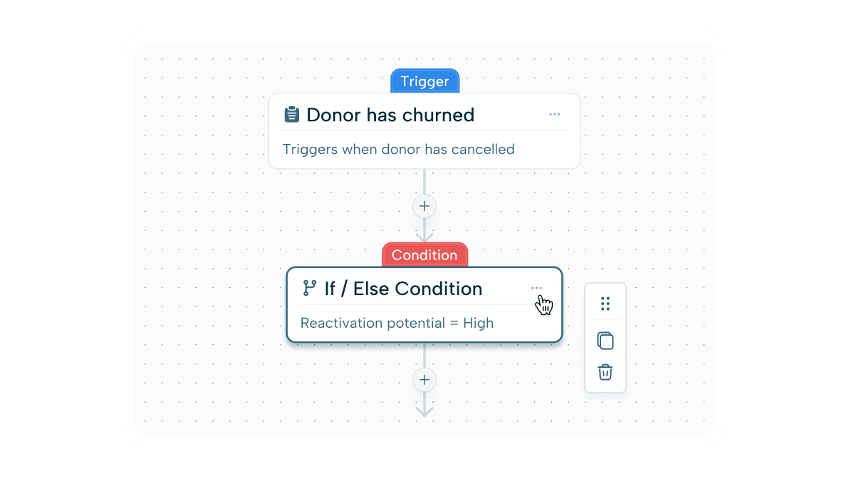 Our prescriptive AI model identifies the next best action to perform for each donor segment and automates it. This lets you deliver targeted, timely messages that drive retention, reactivation and consistent contributions.